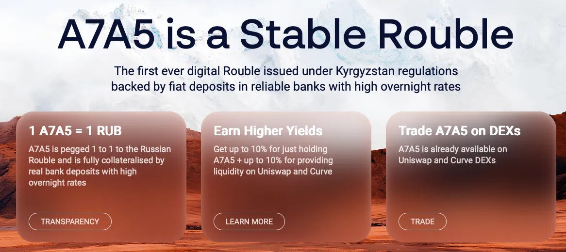 Raportul CIR remarcă faptul că Osman Kabaloev, director adjunct în Departamentul de Politici Financiare al Ministerului de Finanțe al Rusiei, a vorbit despre A7A5 în cadrul unei conferințe a bancherilor ruși, pe 16 aprilie. În cadrul evenimentului, Kabaloev a invocat blocarea portofelelor USDT de către Tether în cazul Garantex și a subliniat importanța dezvoltării unei monede stabile bazate pe rubla rusească. A menționat A7A5 ca fiind „un proiect interesant lansat de colegii noștri din Kârgâzstan” și a adăugat că „există chiar posibilitatea unui fel de randament al investiției”, referindu-se la promisiunea A7A5 de a plăti dobânzi.