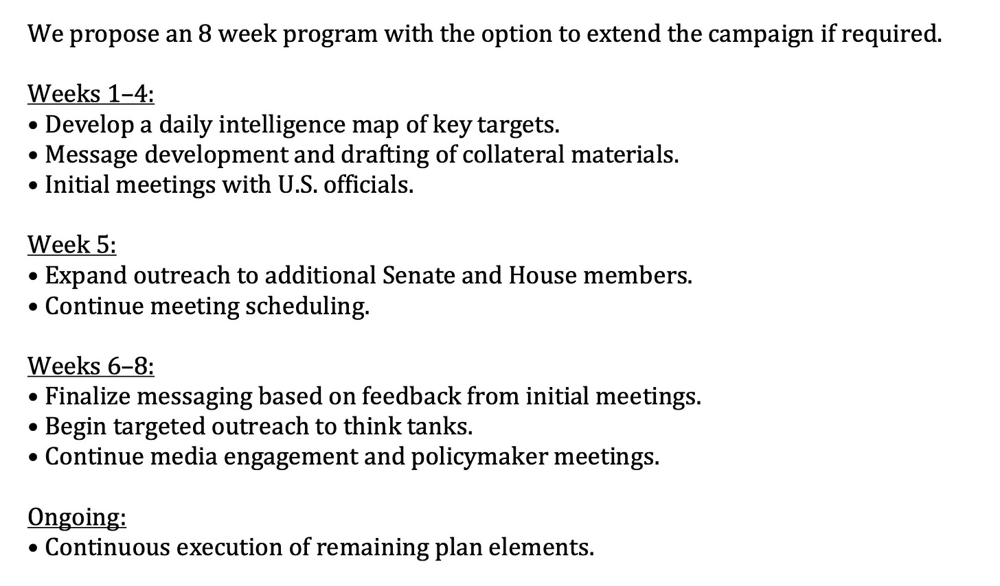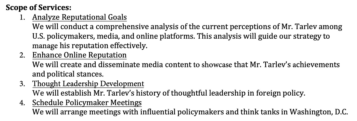 Conform planului propus pe o durată de opt săptămâni, firma urma să cerceteze reputația domnului Tarlev și să dezvolte strategii de comunicare și relaționare cu oficiali americani, membri ai Camerei Reprezentanților și ai Senatului SUA.