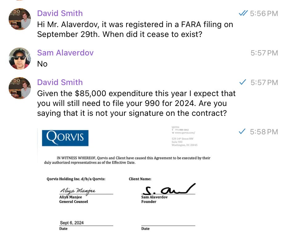 După afirmația inițială, că organizația non-profit nu mai există și aparenta tentativă de a nega declarația FARA, i-am trimis domnului Alaverdov o captură de ecran cu numele și semnătura sa de pe contract. El mi-a spus apoi să „verific numele companiei”, la care i-am răspuns cu capturi de ecran ce arătau denumirea ACFHCUM, adresa, funcția sa etc.