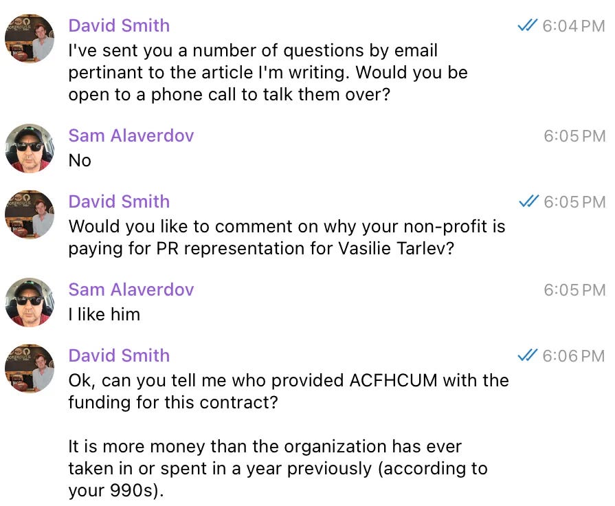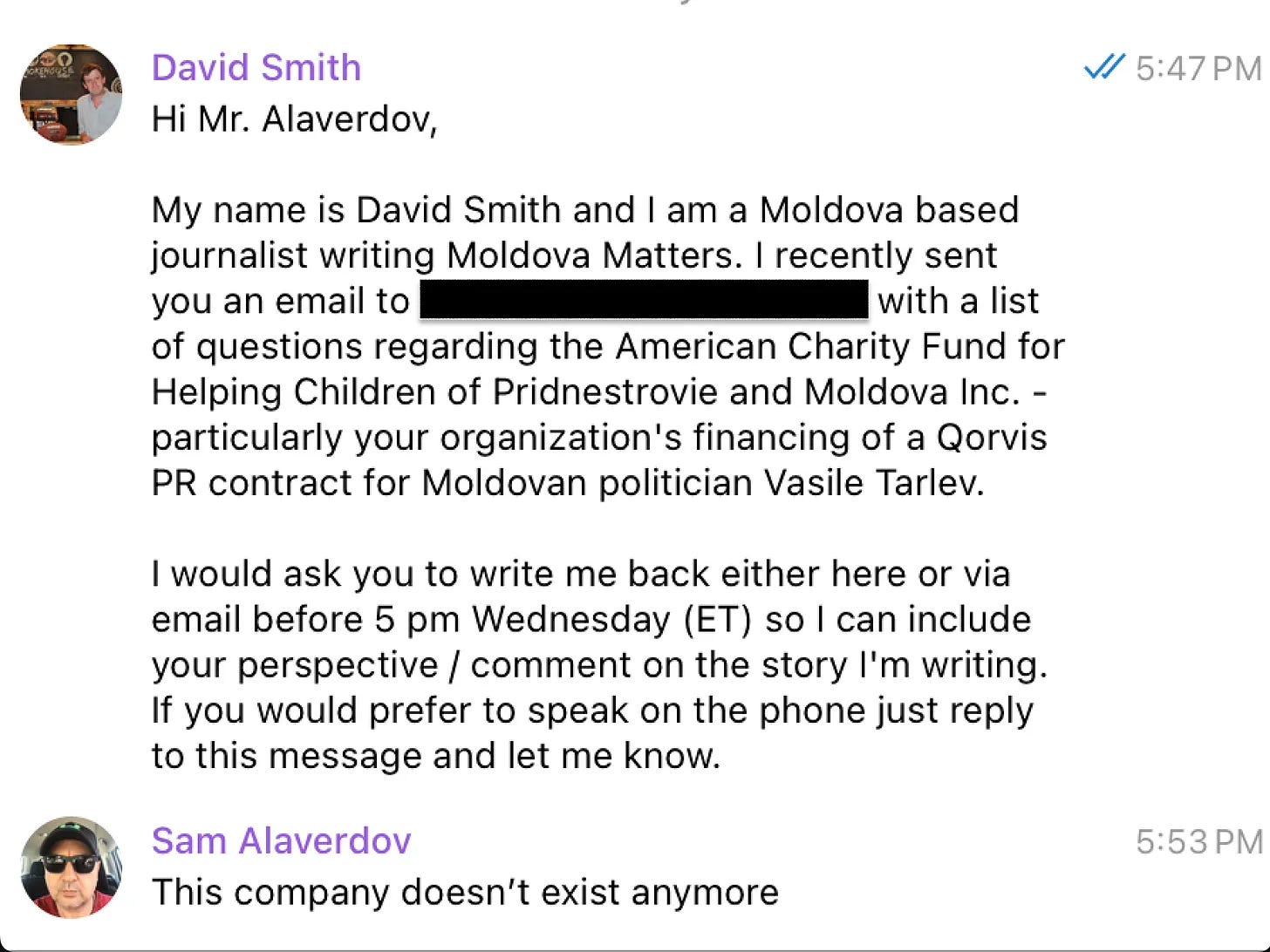 Niciunul dintre directori nu a răspuns la emailurile mele, dar am reușit să iau legătura cu Sam Alaverdov prin Telegram. După ce m-am prezentat și am menționat publicația Moldova Matters, l-am întrebat de ce „American Charity Fund for Helping Children of Pridnestrovie and Moldova Inc.” finanțează un contract de PR pentru Vasilie Tarlev. Domnul Alaverdov a susținut inițial că ACFHCUM nu mai există.