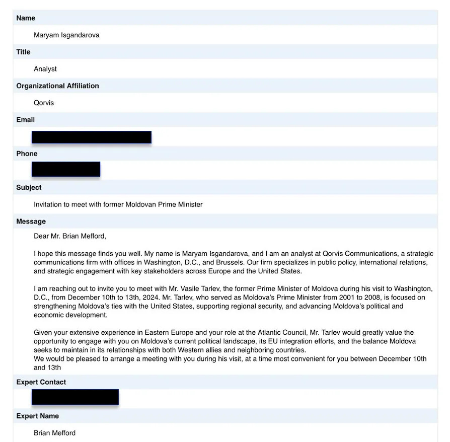 Vom analiza în detaliu această activitate de contact mai jos, însă mai întâi trebuie să menționăm faptul că această listă este incompletă. După publicarea primei mele investigații despre acest contract, Brian Mefford, cercetător senior neremunerat la Atlantic Council, a distribuit un e-mail de contact din partea Qorvis referitor la organizarea unor întâlniri cu Vasile Tarlev. Puteți vedea acest e-mail aici: