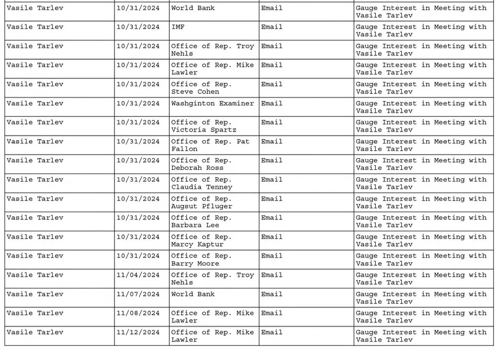 Această listă include 18 e-mailuri trimise pentru a „evalua interesul pentru o întâlnire cu Vasile Tarlev.” Acestea au fost expediate către două instituții internaționale – Banca Mondială și FMI –, către o redacție, „Washginton [sic] Examiner”, și către birourile a 11 membri ai Congresului. Toate e-mailurile inițiale au fost trimise pe 31 octombrie 2024, cu aparent câteva contacte de urmărire ulterioară cu unii destinatari.
