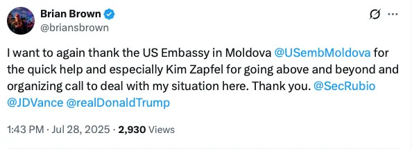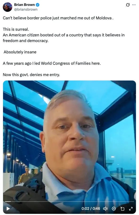 Pe lângă Brian Brown, europarlamentarul ceh Ondřej Dostál a fost împiedicat să intre în Republica Moldova. Ca reacție, acesta a postat: